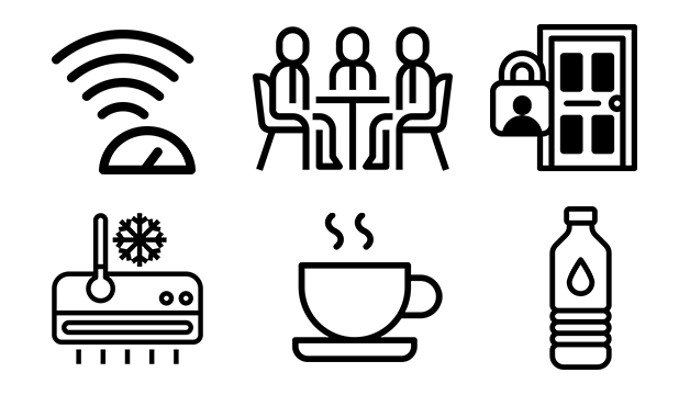 Internet de alta velocidad, salas de reuniones, salitas privadas, climatización, café, agua y más.